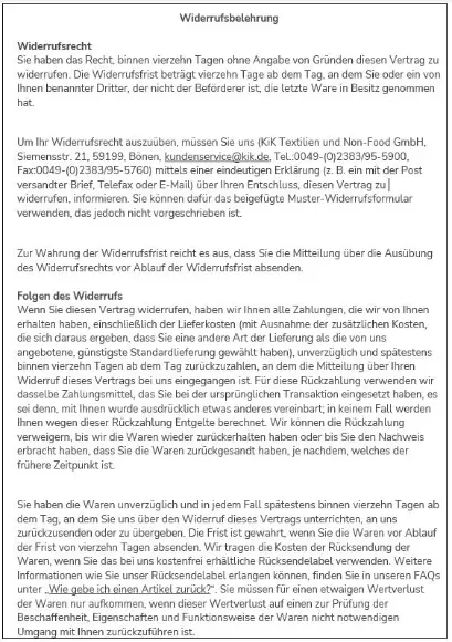 Der Vertrag kommt dann durch eine unverzügliche Mitteilung von KiK per Email, dass Ihr Angebot angenommen wurde oder durch das Zusenden der von Ihnen bestellten Waren innerhalb der in der Artikelbeschreibung genannten Lieferfrist zustande.